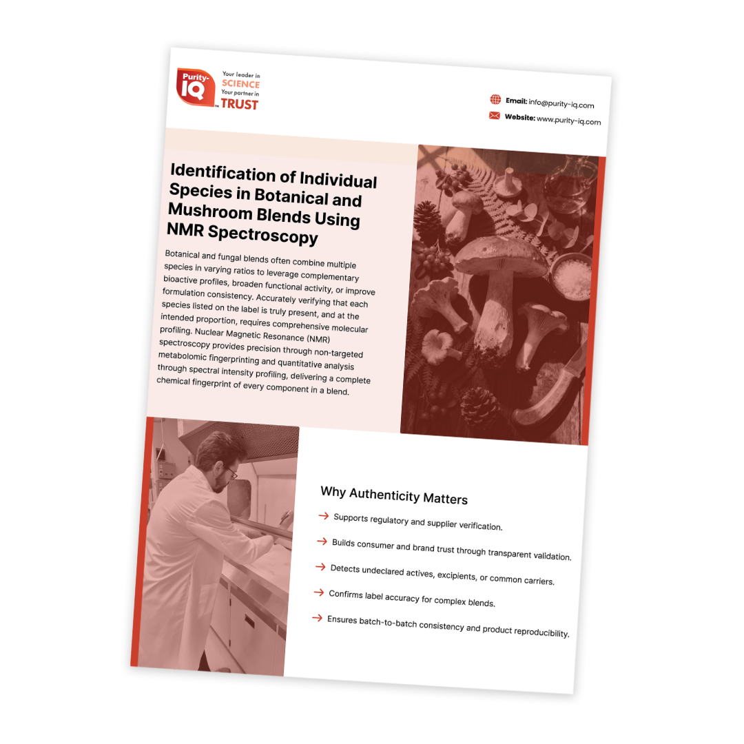 This guide explains how NMR spectroscopy delivers a complete chemical fingerprint of botanical and mushroom blends, enabling species-level authentication, detection of undeclared ingredients, and accurate verification of blend composition for regulatory confidence and product integrity.